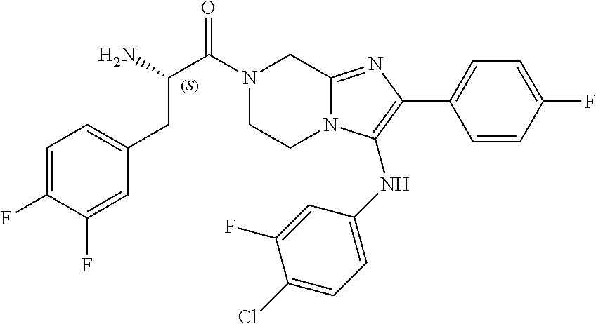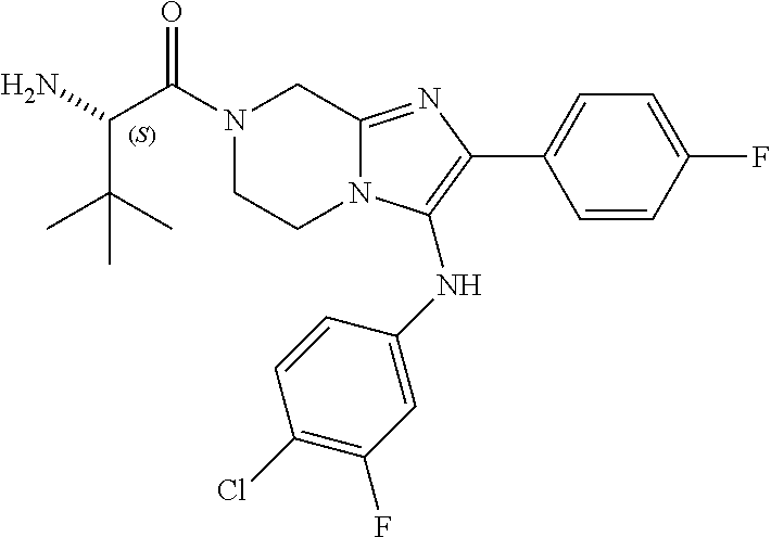 In a further embodiment are compounds selected from: 2-amino-1-(2-(4-fluorophenyl)-3-(4-fluorophenylamino)-8,8-dimethyl-5,6-dihydroimidazo[1,2-a]pyrazin-7(8H)-yl)ethanone; 2-amino-1-(3-(3,4-difluorophenylamino)-2-(4-fluorophenyl)-5,6-dihydroimidazo[1,2-a]pyrazin-7(8H)-yl)-2-methylpropan-1-one; and 2-amino-1-(3-(4-chlorophenylamino)-2-(4-fluorophenyl)-8,8-dimethyl-5,6-dihydroimidazo[1,2-a]pyrazin-7(8H)-yl)ethanone.