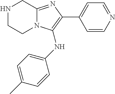 In an embodiment of the invention are compounds selected from: N-(4-methylphenyl)-2-(pyridin-3-yl)-5H,6H,7H,8H-imidazo[1,2-a]pyridin-3-amine; 2-cyclohexyl-N-(2,4,4-trimethylpentan-2-yl)imidazo[1,2-a]pyridin-3-amine; 2-(diphenylmethyl)-N-(2,4,4-trimethylpentan-2-yl)imidazo[1,2-a]pyridin-3-amine; 2-(2-nitrophenyl)-N-(2,4,4-trimethylpentan-2-yl)imidazo[1,2-a]pyridin-3-amine; 2-[2-(thiophen-2-yl)phenyl]-N-(2,4,4-trimethylpentan-2-yl)imidazo[1,2-a]pyridin-3-amine; 2-[2-(difluoromethoxy)phenyl]-N-(2,4,4-trimethylpentan-2-yl)imidazo[1,2-a]pyridin-3-amine; 2-(2-bromophenyl)-N-(2,4,4-trimethylpentan-2-yl)imidazo[1,2-a]pyridin-3-amine; 2-{2-[2-(diethylamino)ethoxy]phenyl}-N-(2,4,4-trimethylpentan-2-yl)imidazo[1,2-a]pyridin-3-amine; 2-[2-(trifluoromethyl)phenyl]-N-(2,4,4-trimethylpentan-2-yl)imidazo[1,2-a]pyridin-3-amine; 2-(2-{3-[(2,4,4-trimethylpentan-2-yl)amino]imidazo[1,2-a]pyridin-2-yl}phenoxy)ethan-1-ol; 2-[2-(furan-2-yl)phenyl]-N-(2,4,4-trimethylpentan-2-yl)imidazo[1,2-a]pyridin-3-amine; 2-(4-fluorophenyl)-6-methyl-N-(4-methylphenyl)imidazo[1,2-a]pyridin-3-amine; N-(4-chloro-3-fluorophenyl)-2-(4-fluorophenyl)-5H,6H,7H,8H-imidazo[1,2-a]pyridin-3-amine; 2-(4-fluorophenyl)-N-(4-methylphenyl)-5H,6H,7H,8H-imidazo[1,2-a]pyridin-3-amine; 2-(4-fluorophenyl)-N-(4-methylphenyl)imidazo[1,2-a]pyridin-3-amine; N-(4-chloro-3-fluorophenyl)-2-(4-fluorophenyl)-6-methylimidazo[1,2-a]pyridin-3-amine; 2-(4-fluorophenyl)-6-methyl-N-(4-methylphenyl)-5H,6H,7H,8H-imidazo[1,2-a]pyridin-3-amine; N-(4-chloro-3-fluorophenyl)-2-(4-fluorophenyl)-6-methyl-5H,6H,7H,8H-imidazo[1,2-a]pyridin-3-amine; 8-(3,4-difluorophenylamino)-9-(4-fluorophenyl)-2,2-dimethyl-5,6-dihydrodiimidazo[1,2-a:2′,1′-c]pyrazin-3(2H)-one; and 8-(3,4-difluorophenylamino)-9-(4-fluorophenyl)-2,2-dimethyl-1,2,5,6-tetrahydrodiimidazo[1,2-a:2′,1′-c]pyrazin-3(10bH)-one.