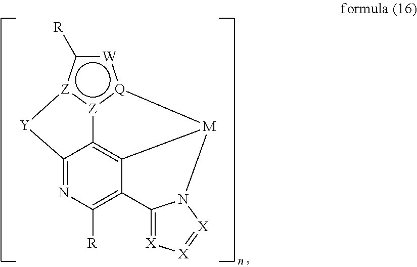 Particular preference is given to Mo(0), W(0), Re(I), Ru(II), Os(II), Rh(III), Cu(I), Ir(III) and Pt(II). Very particular preference is given to Ir(III) and Pt(II).