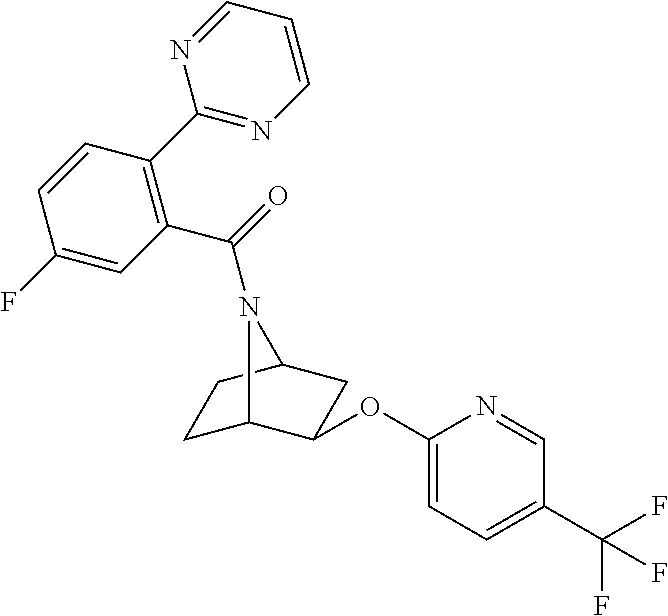 - JUOCZJMNBUTRCI-UHFFFAOYSA-N (3-fluoro-2-pyrimidin-2-ylphenyl)-[3-[5-(trifluoromethyl)pyrimidin-2-yl]oxy-7-azabicyclo[2.2.1]heptan-7-yl]methanone Chemical compound N=1C=CC=NC=1C=1C(F)=CC=CC=1C(=O)N1C(C2)CCC1C2OC1=NC=C(C(F)(F)F)C=N1 JUOCZJMNBUTRCI-UHFFFAOYSA-N 0.000 claims description 7