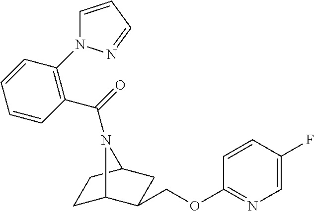 - KLDKRPGZCSJCEY-UHFFFAOYSA-N (3-fluoro-2-methoxyphenyl)-[3-[(5-fluoropyridin-2-yl)oxymethyl]-7-azabicyclo[2.2.1]heptan-7-yl]methanone Chemical compound COC1=C(F)C=CC=C1C(=O)N1C2CCC1CC2COC1=CC=C(F)C=N1 KLDKRPGZCSJCEY-UHFFFAOYSA-N 0.000 claims description 5