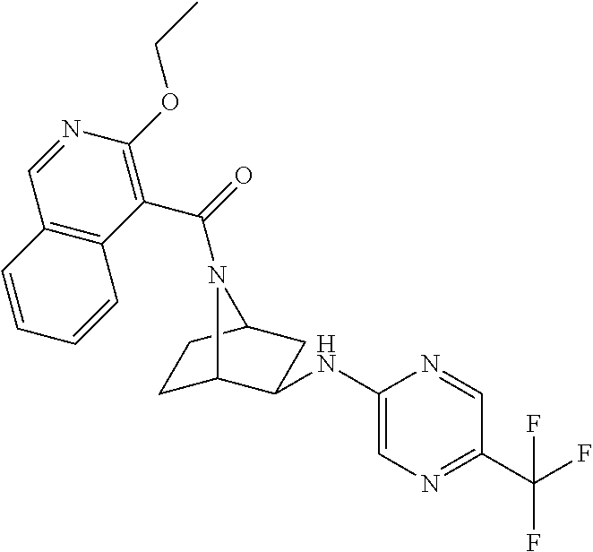- LNLXUBFJNUWYQB-UHFFFAOYSA-N (3-ethoxy-6-methylpyridin-2-yl)-[3-(quinoxalin-2-ylamino)-7-azabicyclo[2.2.1]heptan-7-yl]methanone Chemical compound CCOC1=CC=C(C)N=C1C(=O)N1C2CCC1CC2NC1=CN=C(C=CC=C2)C2=N1 LNLXUBFJNUWYQB-UHFFFAOYSA-N 0.000 claims description 7