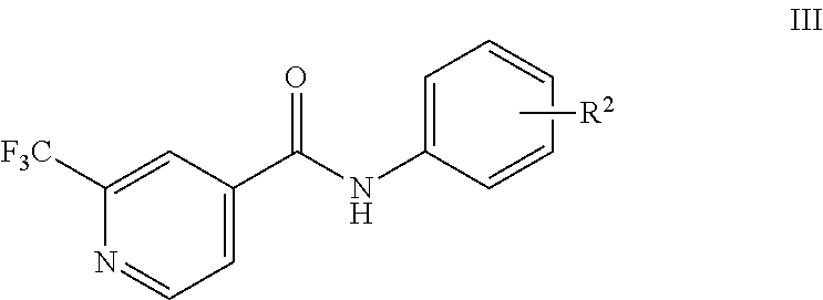 - the compounds of formula III can for instance be prepared according to the PCT Publ. WO 2012/016879 by reacting the 2-trifluoromethyl isonicotinic acid and esters of the formula I with an optionally protected arylamine of formula IV