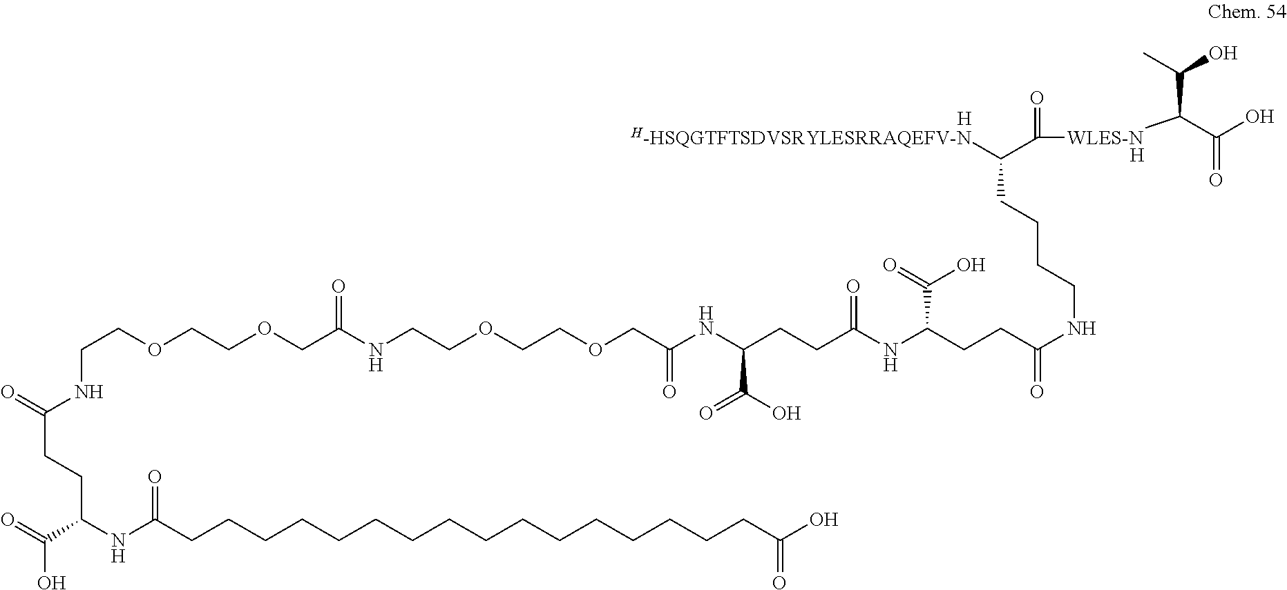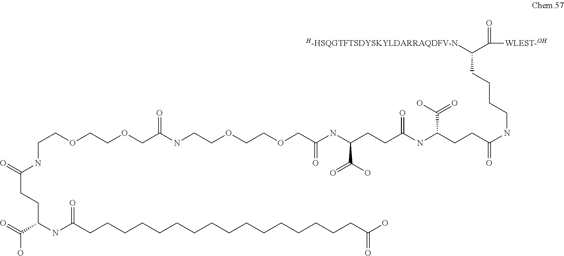 - GCYXWQUSHADNBF-AAEALURTSA-N preproglucagon 78-108 Chemical compound C([C@@H](C(=O)N[C@@H]([C@@H](C)CC)C(=O)N[C@@H](C)C(=O)N[C@@H](CC=1C2=CC=CC=C2NC=1)C(=O)N[C@@H](CC(C)C)C(=O)N[C@@H](C(C)C)C(=O)N[C@@H](CCCCN)C(=O)NCC(=O)N[C@@H](CCCNC(N)=N)C(=O)NCC(O)=O)NC(=O)[C@H](CCC(O)=O)NC(=O)[C@H](CCCCN)NC(=O)[C@H](C)NC(=O)[C@H](C)NC(=O)[C@H](CCC(N)=O)NC(=O)CNC(=O)[C@H](CCC(O)=O)NC(=O)[C@H](CC(C)C)NC(=O)[C@H](CC=1C=CC(O)=CC=1)NC(=O)[C@H](CO)NC(=O)[C@H](CO)NC(=O)[C@@H](NC(=O)[C@H](CC(O)=O)NC(=O)[C@H](CO)NC(=O)[C@@H](NC(=O)[C@H](CC=1C=CC=CC=1)NC(=O)[C@@H](NC(=O)CNC(=O)[C@H](CCC(O)=O)NC(=O)[C@H](C)NC(=O)[C@@H](N)CC=1N=CNC=1)[C@@H](C)O)[C@@H](C)O)C(C)C)C1=CC=CC=C1 GCYXWQUSHADNBF-AAEALURTSA-N 0.000 claims description 35