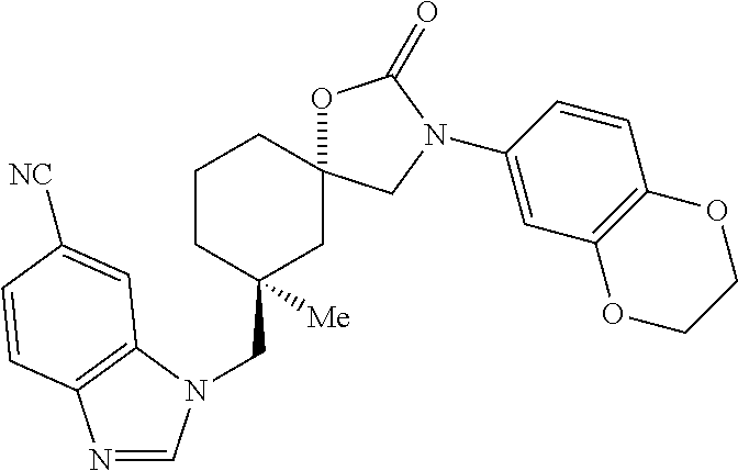 - GVDLNCMXEPRKHN-UIOOFZCWSA-N 3-[[(5s,7s)-3-(2,3-dihydro-1,4-benzodioxin-6-yl)-7-methyl-2-oxo-1-oxa-3-azaspiro[4.5]decan-7-yl]methyl]benzimidazole-5-carbonitrile Chemical compound O1CCOC2=CC(N3C[C@@]4(CCC[C@@](C4)(CN4C5=CC(=CC=C5N=C4)C#N)C)OC3=O)=CC=C21 GVDLNCMXEPRKHN-UIOOFZCWSA-N 0.000 claims description 3