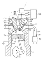 Intake valves 21 are disposed in the cylinder head 13 to shut off (close) the intake ports 18 from the combustion chamber 17 and exhaust valves 22 are disposed in the cylinder head 13 to shut off (close) the exhaust ports 19 from the combustion chamber 17. Each intake valve 21 is operated by an intake valve operating mechanism 21 a, and each exhaust valve 22 is operated by an exhaust valve operating mechanism 22 a. The intake and exhaust valves 21 and 22 reciprocate at predetermined timings to open and close the intake and exhaust ports 18 and 19, respectively, and thus, gas within the cylinder 11 is exchanged. The intake and exhaust valve operating mechanisms 21 a and 22 a have respective intake and exhaust camshafts (not illustrated) operably coupled to a crankshaft 16, and the intake and exhaust camshafts rotate in synchronization with a rotation of the crankshaft. Moreover, at least the intake valve operating mechanism 21 a includes a variable phase mechanism (Variable Valve Timing: VVT) 21 b driven by either one of a hydraulic force and a mechanic force and for continuously varying a phase of the intake camshaft within a predetermined angle range. Note that, a variable lift mechanism for continuously varying a valve lift (Continuous Variable Valve Lift: CVVL) may be provided along with the VVT 21 b.