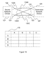 FIG. 1A is a network diagram illustrating three bonded communication links formed between one network interface of a source network device and three network interfaces of a destination network device, and the corresponding exemplary matrix storing the latency differences among the three bonded communication links,