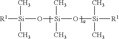 - a sample comprising 1% of the test silicone, 65% anhydrous ethanol and 34% water by weight is prepared. 50 ml of solution is added to a 100 ml graduated cylinder, and shaken for five seconds. The height of foam is measured initially after shaking, and after one and three minutes on standing.