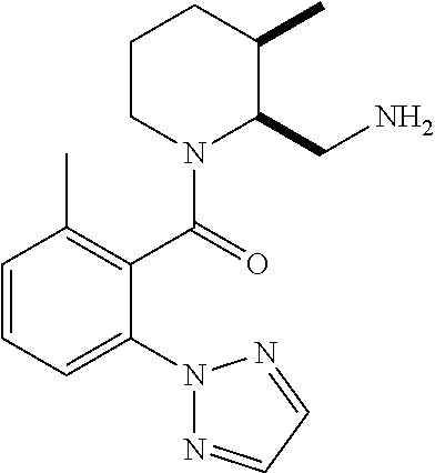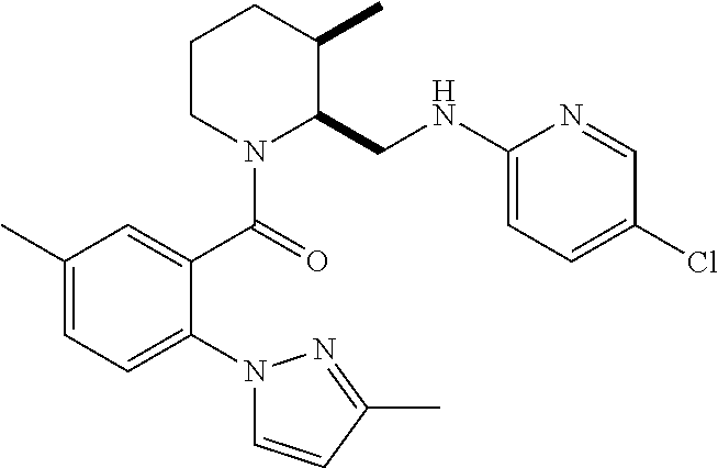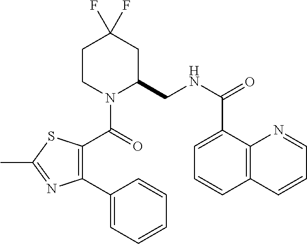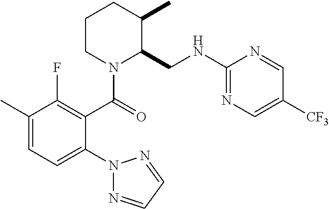 The 3-methylpiperidine substituent has a marked effect on OX1/OX2 selectivity. As shown in Table 5, reference compound SR-12376, which lacks any 3-methyl substituent on the central piperidine ring, shows approximately five-fold selectivity for OX1. Reference compound SR-12365, which includes a dimethyl substituent at that position, has a selectivity ratio of approximately 20. Comparative Example A311 with a “alpha” methyl group, has a selectivity ratio of approximately 110, while Example 75, with an “beta” methyl group has a selectivity ratio of over 1000.