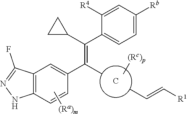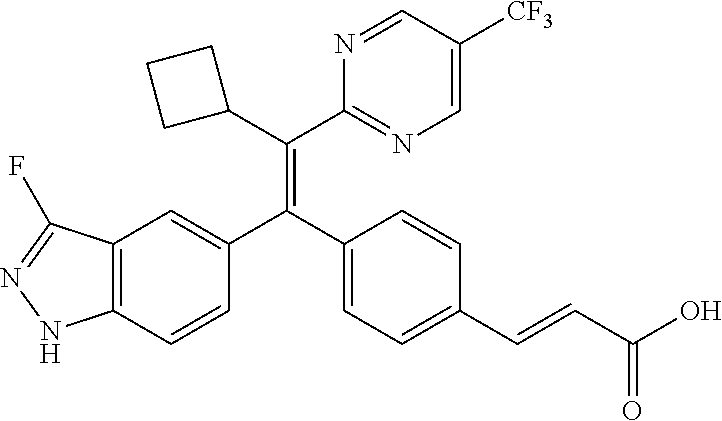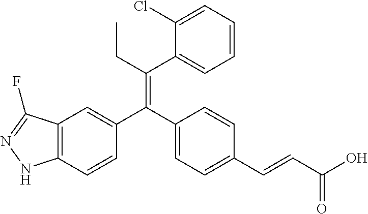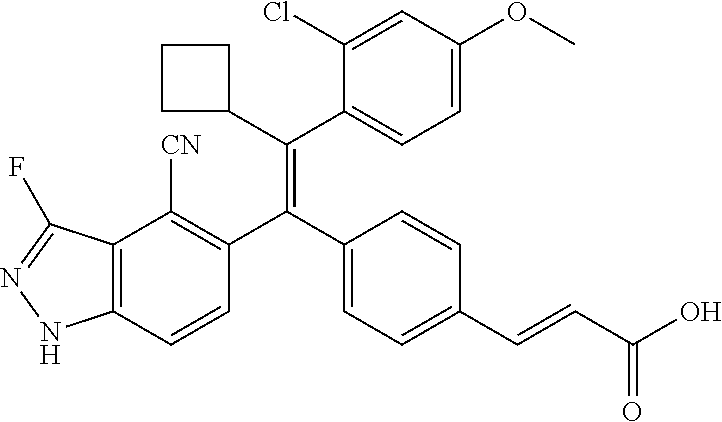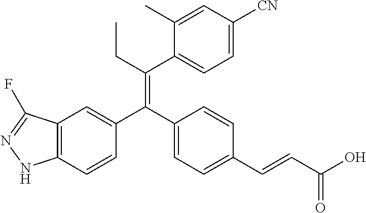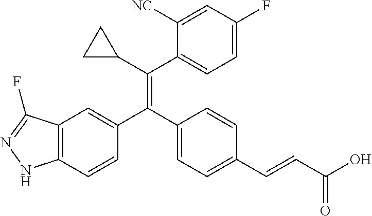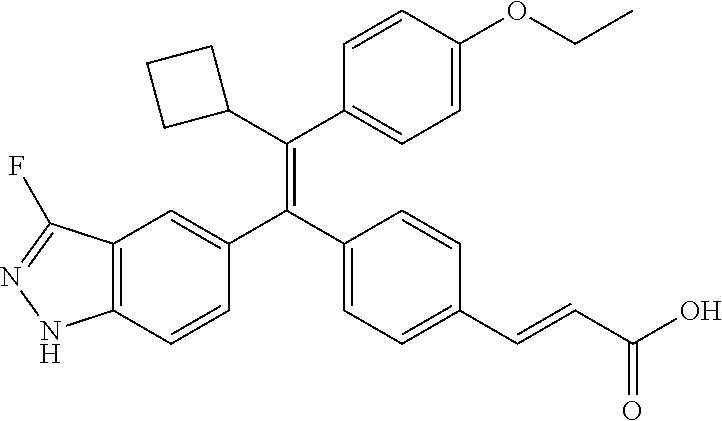 - provided that the compound is not (E)-3-(4-((E)-1-(3-Fluoro-1H-indazol-5-yl)-2-phenylbut-1-en-1-yl)phenyl)acrylic acid; (E)-3-(4-((E)-2-Cyclobutyl-1-(3-fluoro-1H-indazol-5-yl)-2-phenylvinyl)phenyl)acrylic acid; (E)-3-(4-((E)-2-(2-Chloro-4-fluorophenyl)-1-(3-fluoro-1H-indazol-5-yl)but-1-en-1-yl)phenyl)acrylic acid; (E)-3-(4-((E)-2-(2-Chloro-4-fluorophenyl)-2-cyclobutyl-1-(3-fluoro-1H-indazol-5-yl)vinyl)phenyl)acrylic acid; (E)-3-(4-((E)-2-(3-Chloropyridin-4-yl)-1-(3-fluoro-1H-indazol-5-yl)but-1-en-1-yl)phenyl)acrylic acid; (E)-3-(4-((E)-2-(3-Chloropyridin-4-yl)-2-cyclobutyl-1-(3-fluoro-1H-indazol-5-yl)vinyl)phenyl)acrylic acid; (E)-3-(4-((E)-1-(3-Fluoro-1H-indazol-5-yl)-2-(4-methylthiophen-3-yl)but-1-en-1-yl)phenyl)acrylic acid; (E)-3-(4-((E)-2-Cyclobutyl-1-(3-fluoro-1H-indazol-5-yl)-2-(4-methylthiophen-3-yl)vinyl)phenyl)acrylic acid; (E)-3-(4-((E)-2-Cyclobutyl-1-(3-fluoro-1H-indazol-5-yl)-2-phenylvinyl)phenyl)-N-cyclopropylacrylamide; (E)-3-(4-((E)-2-Cyclobutyl-1-(3-fluoro-1H-indazol-5-yl)-2-phenylvinyl)phenyl)-N-(2-hydroxyethyl)acrylamide; or (E)-3-(4-((E)-2-Cyclobutyl-1-(3-fluoro-1H-indazol-5-yl)-2-phenylvinyl)phenyl)-N-(2,2,2-trifluoroethyl)acrylamide.