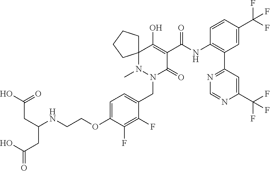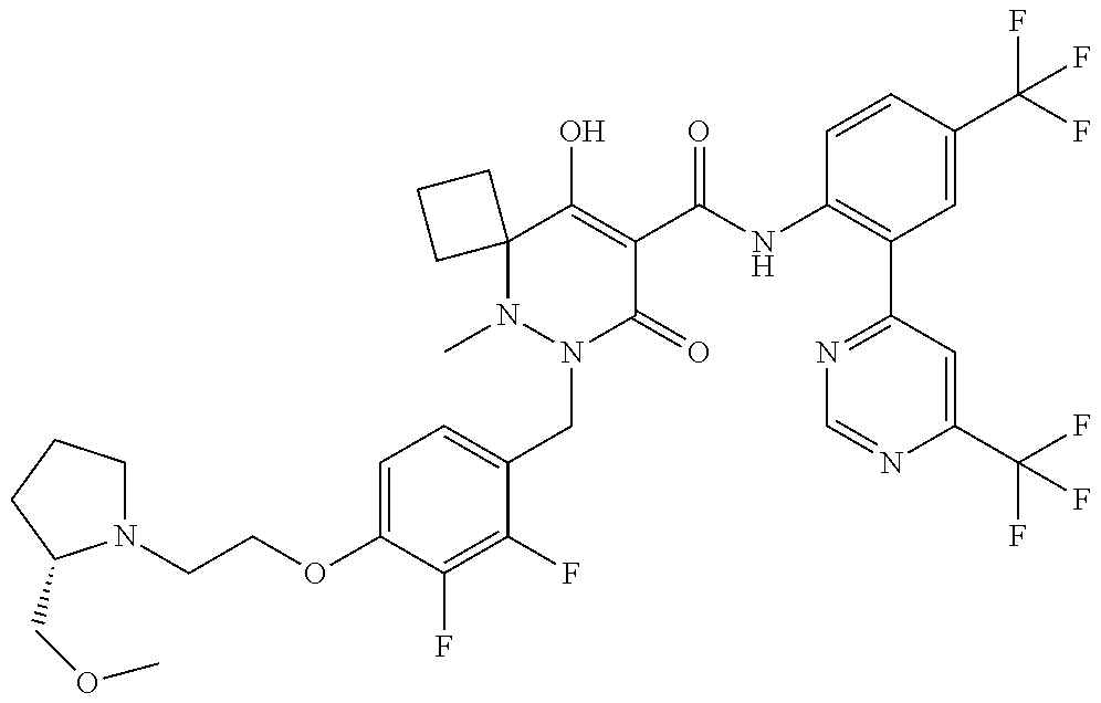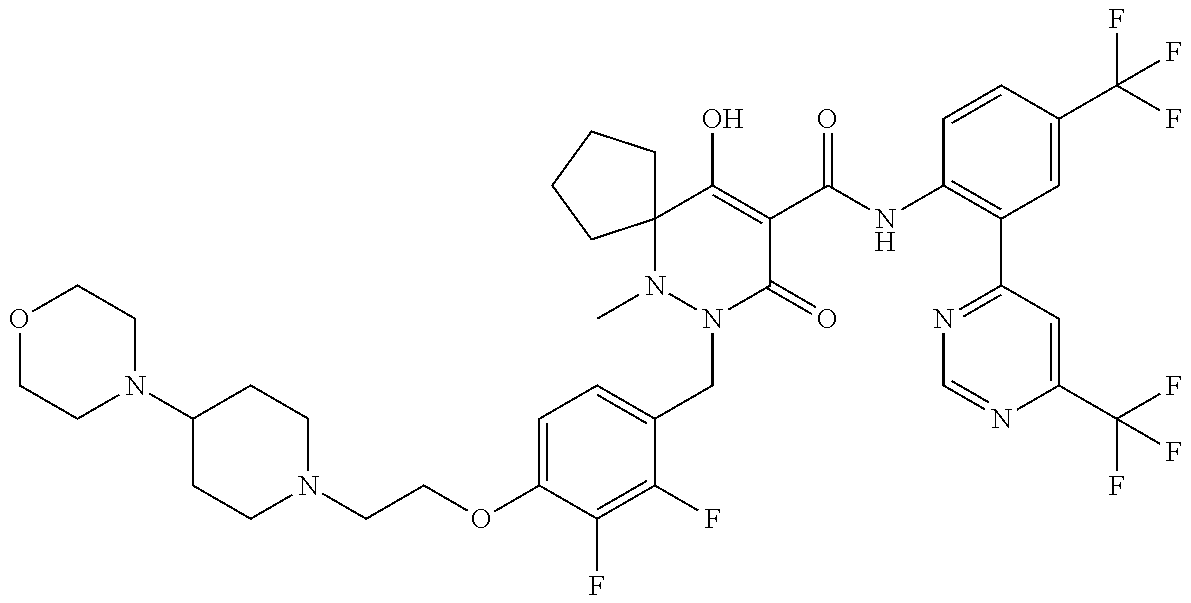 7-(4-(3-(Dimethylamino)-2,2- dimethylpropoxy)-2,3- difluorobenzyl)-10- hydroxy-6-methyl- 8-oxo-N-(4-(tri- fluoromethyl)-2-(6- (trifluoromethyl) pyrimidin-4- yl)phenyl)-6,7-diazaspiro [4.5]dec-9- ene-9-carboxamide |