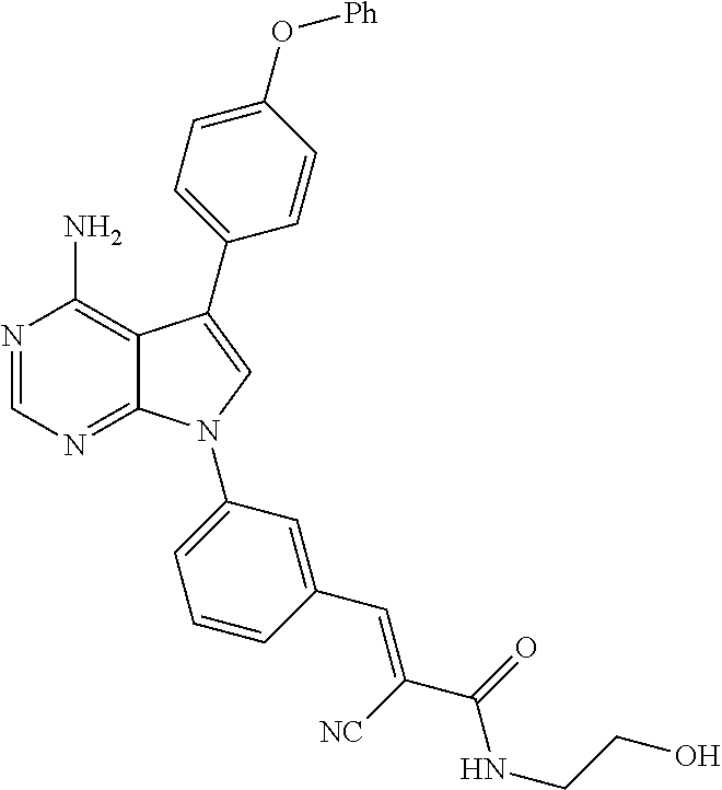 A 4 mL vial fitted with a magnetic stir bar was charged with 3-(4-amino-5-(4-phenoxyphenyl)-7H-pyrrolo[2,3-d]pyrimidin-7-yl)benzaldehyde (5 mg, 0.01 mmol), 2-cyano-N-(1-hydroxy-2-methylpropan-2-yl)acetamide (5 mg, 0.03 mmol), piperidinium acetate (2 mg, 0.02 mmol), and 2-propanol (0.5 mL). The reaction mixture was heated to 60° C. for 24 h. The solution was concentrated under reduced pressure and the resulting residue was purified by Si-gel chromatography (elute 100% EtOAc to 10% MeOH/EtOAc) to yield the product, which was further purified by RP-HPLC (gradient: 20-95% MeCN/water with 0.1% TFA over 25 min) to yield the product as a white solid (1.5 mg, 22% yield). Exact Mass: 544.22. M/z found: 545.0 (M+H)+.