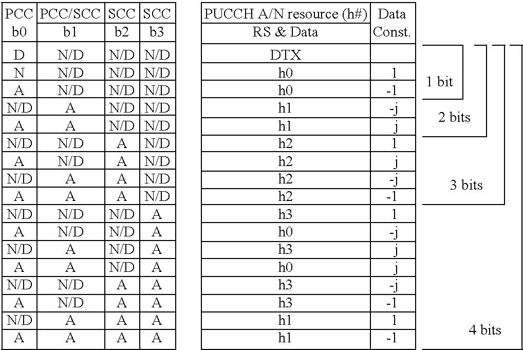For example, of the 2 bits in the RS modulation symbol d(10) in Table 19, an MSB may be mapped to ACK/NACK for the ‘SPS PDSCH’ and an LSB may be mapped to ACK/NACK for the ‘PDSCH corresponding to a PDCCH with DAI=1’ or the ‘DL SPS release PDCCH with DAI=1’. Alternatively, the respective ACK/NACK responses may be mapped to the MSB and LSB in the reverse manner of the above example. In this way, the 2-bit ACK/NACK information may be mapped to an RS modulation symbol and transmitted through PUCCH format 2b(/2a).