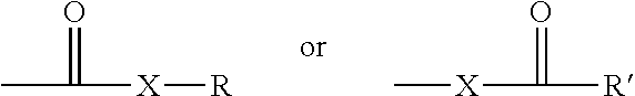 wherein X is a bond or represents an oxygen or a sulfur, and R and R′ are as defined above. Where X is an oxygen and R or R′ is not hydrogen, the formula represents an “ester”. Where X is an oxygen and R is as defined above, the moiety is referred to herein as a carboxyl group, and particularly when R is a hydrogen, the formula represents a “carboxylic acid”. Where X is an oxygen and R′ is hydrogen, the formula represents a “formate”. In general, where the oxygen atom of the above formula is replaced by sulfur, the formula represents a “thiocarbonyl” group. Where X is a sulfur and R or R′ is not hydrogen, the formula represents a “thioester.” Where X is a sulfur and R is hydrogen, the formula represents a “thiocarboxylic acid.” Where X is a sulfur and R′ is hydrogen, the formula represents a “thioformate.” On the other hand, where X is a bond, and R is not hydrogen, the above formula represents a “ketone” group. Where X is a bond, and R is hydrogen, the above formula represents an “aldehyde” group.