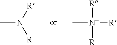 wherein R, R′, and R″ each independently represent a hydrogen, an alkyl, an alkenyl, —(CH2)m-RC or R and R′ taken together with the N atom to which they are attached complete a heterocycle having from 4 to 8 atoms in the ring structure; RC represents an aryl, a cycloalkyl, a cycloalkenyl, a heterocycle or a polycycle; and m is zero or an integer in the range of 1 to 8. In preferred embodiments, only one of R or R′ can be a carbonyl, e.g., R, R′ and the nitrogen together do not form an imide. In still more preferred embodiments, the term “amine” does not encompass amides, e.g., wherein one of R and R′ represents a carbonyl. In even more preferred embodiments, R and R′ (and optionally R″) each independently represent a hydrogen, an alkyl or cycloakly, an alkenyl or cycloalkenyl, or alkynyl. Thus, the term “alkylamine” as used herein means an amine group, as defined above, having a substituted (as described above for alkyl) or unsubstituted alkyl attached thereto, i.e., at least one of R and R′ is an alkyl group