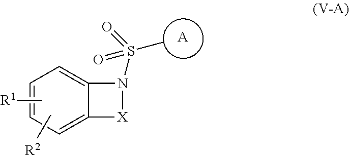 In certain embodiments, A is phenyl substituted with 1, 2, or 3 substituents independently selected from the group consisting of C1-6haloalkyl, —N(R3)(R4), —CO2R6, —C1-6alkylene-N(R3)(R4), —C1-6alkylene-C1-6alkoxy, —C1-6alkylene-CO2R6, —O—C1-6alkylene-N(R3)(R4), and —N(R5)C(O)—C1-6alkylene-N(R3)(R4). In certain embodiments, R2 is —N(R7)C(O)R8. In certain embodiments, R8 is aryl substituted with 1, 2, or 3 substituents independently selected from the group consisting of halogen, C1-6alkyl, and C1-6haloalkyl. In certain embodiments, R8 is phenyl substituted with 2 substituents independently selected from the group consisting of halogen, C1-6alkyl, and C1-6haloalkyl, where the first substituent is located at the 2-position of the phenyl group, and the second substituent is located at the 6-position of the phenyl group. In certain embodiments, y is 1.