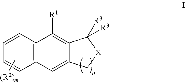 FIG. 2B is the absorption (dashed line) and fluorescent emission (solid lines) spectra of 1-(7-(dimethylamino)-2,3-dihydro-1H-cyclopenta[b]naphthalen-4-yl)ethanone in organic solvents of different polarity. Absorption spectrum was recorded in CH2Cl2. The excitation wavelength was 334 nm.