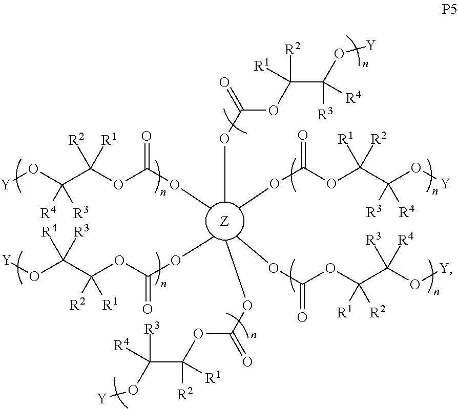 These structures are to be interpreted to encompass copolymers incorporating any ratio of the different monomer units depicted unless otherwise specified. This depiction is also meant to represent random, tapered, block co-polymers, and combinations of any two or more of these and all of these are implied unless otherwise specified.
