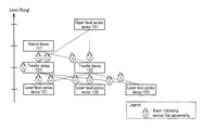 Further, alarm displays may be added to the method of representing in a plan all the connections among the rungs illustrated in FIG. 3 (see FIG. 7). This method, however, while representing all the connections among the devices, fails to show the geographical relationship among the devices, making it difficult to interpret the extent of obstruction. Also, in FIG. 7 illustrating an example of a display screen showing that an obstruction caused by the transfer devices 121, 122 affects a large number of devices across a multiple rungs (a telecommunication obstruction), the display screen viewer has difficulties understanding which rung has caused the abnormality, on the screen.