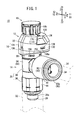 As discussed above, the casing 16 is constituted from the extension 20 and the main mechanism accommodating section 22. The main mechanism accommodating section 22 is formed in a three-dimensional shape, the outer profile of which projects outward slightly with respect to the extension 20 in the Y direction (widthwise direction) and the X2 direction, and projects outward significantly in the X1 direction. At a height position where the outer diameter of the main mechanism accommodating section 22 is maximum, as viewed in planar cross section (see FIG. 4A), the outer profile thereof is formed in an oblate shape (a so-called oval shape) that is deviated eccentrically in the X1 direction beyond the axial center of the flow rate control valve 14 (needle valve 42). Further, in the main mechanism accommodating section 22, the casing 16 is capable of being divided into an upper case 124 and a lower case 126.