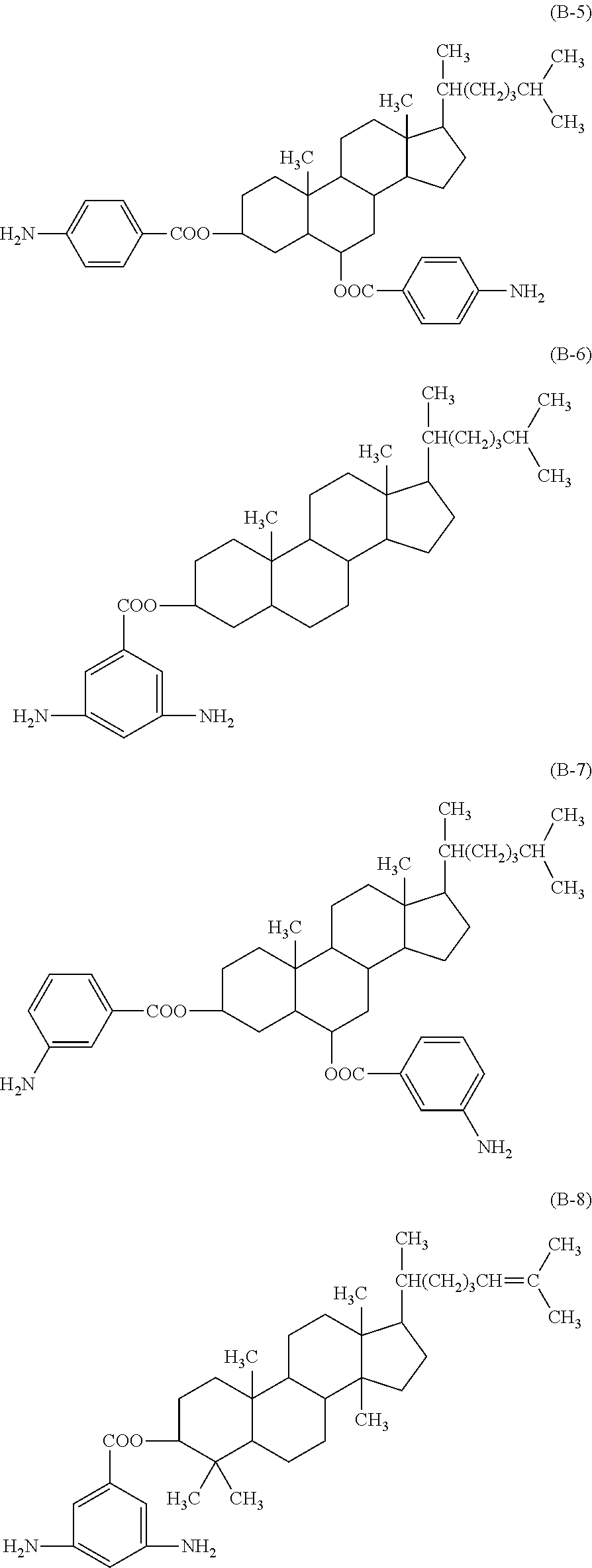 In Example 5, the TFT substrate 20 and the CF substrate 30 were respectively coated with a polyimide material using the compound shown in (AZ-11) and the compound (C-1) at a weight ratio of 9:1 as a diamine material and the tetracarboxylic acid dianhydride shown in Formula (E-2) as a dianhydride obtained by using a spin coater. After that, the coated film was dried for 80 seconds with the use of a hot plate at 80 deg C. Subsequently, the TFT substrate 20 and the CF substrate 30 were heated for 1 hour in an oven at 200 deg C. under nitrogen gas atmosphere. Thereby, the alignment films 22 and 32 having a thickness of 90 nm on the pixel electrode 20B and the opposed electrode 30B were formed.