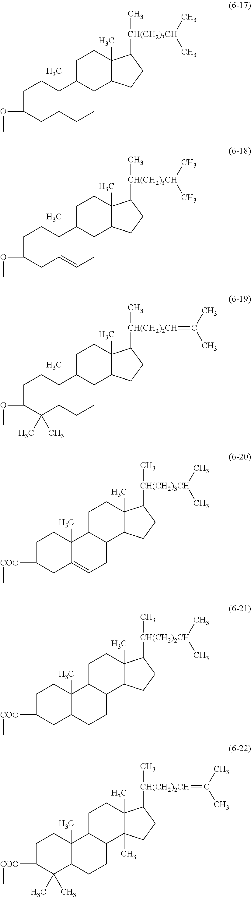 In the formulas, Y1 represents an alkyl group with the carbon number of 10 or more, an alkoxy group with the carbon number of 10 or more, or a monovalent organic group containing a ring structure. Further, Y2 to Y15 represent a hydrogen atom, an alkyl group with the carbon number of 10 or more, an alkoxy group with the carbon number of 10 or more, or a monovalent organic group containing a ring structure. At least one of Y2 and Y3, at least one of Y4 to Y6, at least one of Y7 and Y8, at least one of Y9 to Y12, and at least one of Y13 to Y15 are an alkyl group with the carbon number of 10 or more, an alkoxy group with the carbon number of 10 or more, or a monovalent organic group containing a ring structure. However, Y11 and Y12 may be bonded to each other to form a ring structure.