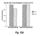 FIGS. 12A-12B: Differential scanning fluorescence can be used to estimate serum stability. 12A) Microscopic stability measurement by differential scanning fluorimetry. 12B) Macroscopic stability measured by percent of binding activity before (100%) and after 3 day incubation in mouse serum at 37° C. The proof-of-concept bispecific protein exhibits inferior stability compared to a stabilized analog in both microscopic (12A) and macroscopic (12B) properties.