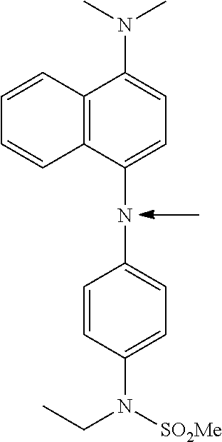 In formulae (2) and (3), R2, R3, R5, R6, R7, R8, R10 and R11 each independently represents a hydrogen atom or an alkyl group, or R5 and R6, R7 and R8 or R6 and R7 may be connected with each other to form a condensed ring structure, R4 and R9 each independently represents NR18R19, R18 and R19 each independently represents a hydrogen atom, an alkyl group or an alkylsulfonyl group, and R12, R13 and R14 each independently represents a phenyl group having a dialkylamino group in its 4-position.