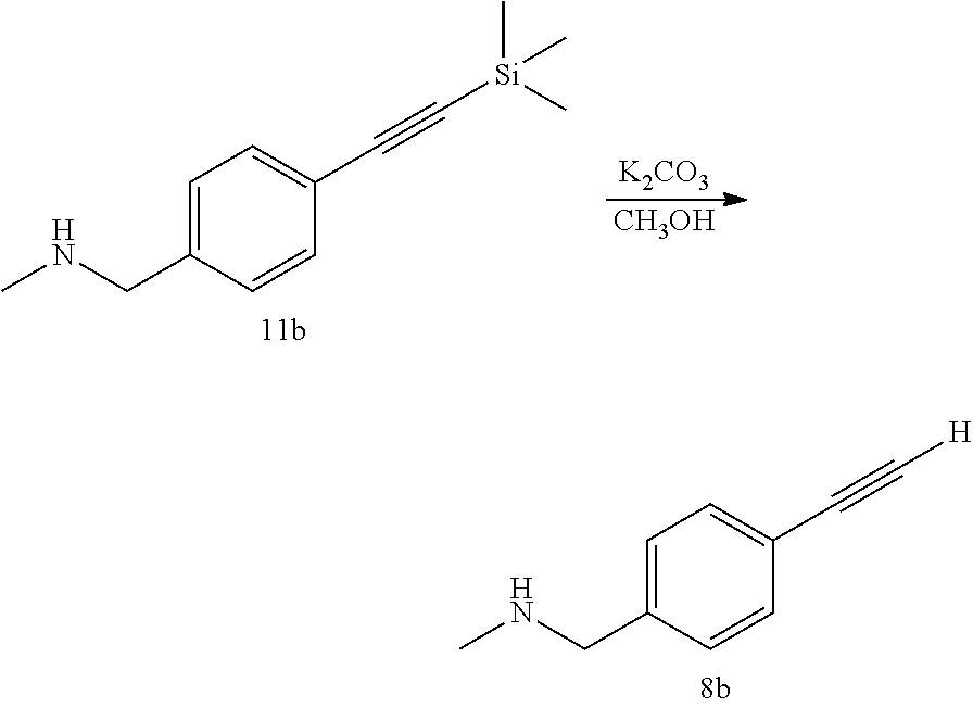 g) compound 10 or 12 is subjected to a Sonogashira reaction to form compound 11 or 13, respectively;