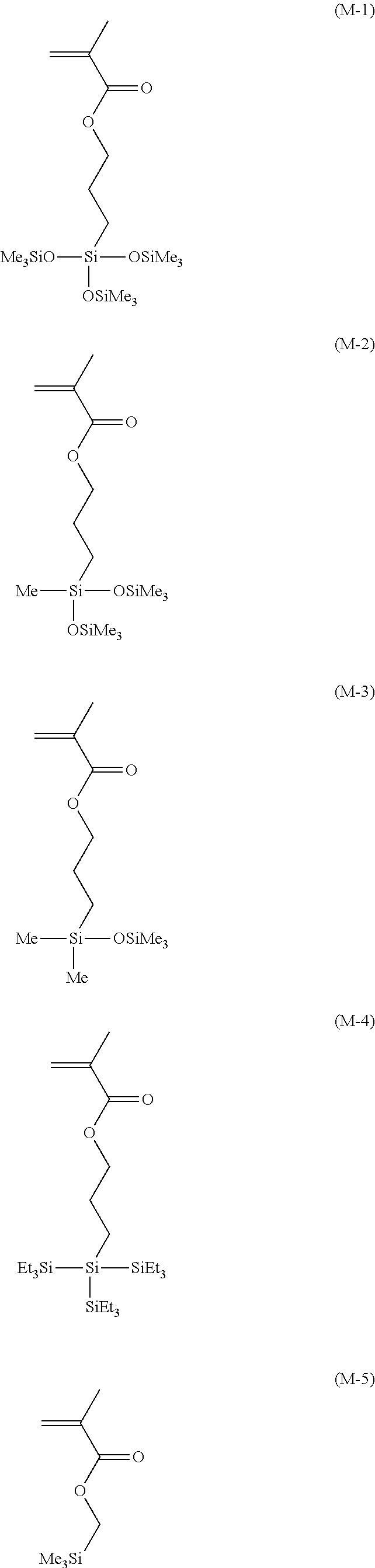 - QCVBOKOFDYOABC-UHFFFAOYSA-N C=C(C)C(=O)OCC.C=C(C)C(=O)OCCC[Si](C)(C)O[Si](C)(C)C.C=C(C)C(=O)OCCC[Si](C)(O[Si](C)(C)C)O[Si](C)(C)C.C=C(C)C(=O)OCCC[Si](C)(O[Si](C)(C)C)O[Si](C)(C)C.C=C(C)C(=O)OCCC[Si](C)([Si](CC)(CC)CC)[Si](CC)(CC)CC Chemical compound C=C(C)C(=O)OCC.C=C(C)C(=O)OCCC[Si](C)(C)O[Si](C)(C)C.C=C(C)C(=O)OCCC[Si](C)(O[Si](C)(C)C)O[Si](C)(C)C.C=C(C)C(=O)OCCC[Si](C)(O[Si](C)(C)C)O[Si](C)(C)C.C=C(C)C(=O)OCCC[Si](C)([Si](CC)(CC)CC)[Si](CC)(CC)CC QCVBOKOFDYOABC-UHFFFAOYSA-N 0.000 description 1