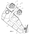 Similar to the venting systems 140, 240, 340, and 440, the air cools the gear case 525 as well as the motors and the internal motor housings (not shown) disposed inside the housing 520. The cool air first cools the interior motor housings and motors prior to cooling the gear case 525. Once the air has cooled the motors, the internal motor housings, and the gear case 525, the warmed air then exits through an aperture 598 disposed along an exterior surface 550 of the housing 520. The aperture 598 is a vertically oriented elongate aperture disposed between the external motor housings 570, although other constructions include different numbers, locations, sizes and configurations for the aperture or apertures 598.