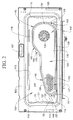 With convection cover 100 mounted in the manner discussed above, fan 209 is arranged behind intake 138 such that activation of motor 193 causes air to be drawn into intake 138 and propelled radially outwardly from fan 209 toward second end portion 147 and outlet openings 153. In accordance with the invention, at a minimum, the configuration of convection cover 100 establishes a duct, in combination with rear wall 102, for this airflow. In the preferred embodiment shown, recessed section 177 accommodates fan 209 and further establishes a portion of this duct. That is, at this point, it should be recognized that the invention can be employed without recessed section 177, thereby establishing the required airflow duct based solely on the construction of convection cover 100 in combination with rear wall 102. However, with the inclusion of recessed section 177, the thickness or depth of convection cover 100 can be reduced without sacrificing the volumetric airflow capacity of the overall system. To this end, recessed section 177 is preferably formed in rear wall 102, such as through a stamping operation. In any case, during operation of the overall convection system, air is drawn into central opening 138 at one side portion of oven cavity 104, forced behind convection cover 100 to outlet openings 153 at a second side portion of the oven cavity 104. Due to these spaced locations, the airflow in the overall oven cavity 104 will be forced to flow forward from adjacent side wall 116 towards door 10, then along door 10 to adjacent second side wall 115 and back toward central opening 138. To this end, convection cover 100 is constructed such that the central intake 138 is arranged to draw air into fan 209 at only one side of oven cavity 104, while the plurality of small exhaust openings 153 are provided at the other side of oven cavity 104 such that the overall arrangement forces the air to follow a single, circular airflow pattern or loop around the interior of oven cavity 104. This overall configuration is seen to be particularly important with the reduced sized oven cavity of the invention which generally has a volume in the order of 2.5 cubic feet or less. By providing one or more tapered sections associated with convection cover 100, particularly tapered sections 140 and 145, the pressure and flow rate of the airflow is optimized in order to ensure an effective circular airflow pattern throughout oven cavity 104.
