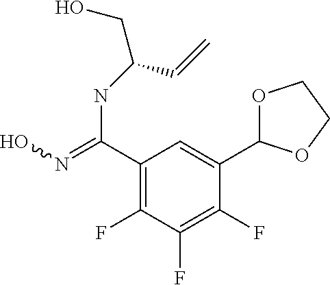 Growth of S. aureus and S. pyogenes over twenty passages in liquid medium containing sub-inhibitory concentrations of Example 5 was done to study the emergence of resistance. After twenty passages in the presence of increasing selective pressure of Example 5, variants of S. aureus and S. pyogenes ARC838 had been isolated that displayed 32-fold, 16-fold, and 8-fold decreases in susceptibility over the starting culture. This loss of susceptibility to Example 5 did not correlate with any changes in susceptibility that was greater than 4-fold to linezolid, vancomycin, and levofloxacin.