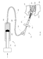 Then in FIG. 2C, an inflatable bone tamp 220 is placed into cannula 110. Inflatable bone tamp 220 includes a shaft 221 (e.g., a catheter), an expandable structure 223 (e.g., a balloon) at the distal end of shaft 221, and a connector 222 (e.g., a Luer Lock fitting) at the proximal end of shaft 221. Inflatable bone tamp 220 is coupled by flexible tubing 295 to an inflation syringe 291.