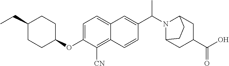 - TXFYRBVZMIMJJX-REYGYFPDSA-N CC(C1=CC2=CC=C(O[C@H]3CC[C@@H](C)CC3)C(C#N)=C2C=C1)N1C2CCCC1CC(C(=O)O)C2 Chemical compound CC(C1=CC2=CC=C(O[C@H]3CC[C@@H](C)CC3)C(C#N)=C2C=C1)N1C2CCCC1CC(C(=O)O)C2 TXFYRBVZMIMJJX-REYGYFPDSA-N 0.000 description 2