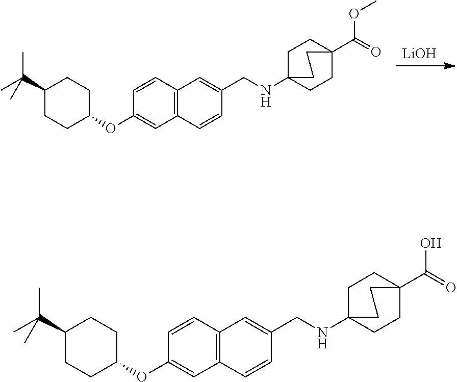 - TXSCXJCYYDLTKD-PAYXEYBTSA-N CC(C)(C)[C@H]1CC[C@@H](OC2=CC=C3C=C(CNC45CCC(C(=O)O)(CC4)CC5)C=CC3=C2)CC1.CC(C)(C)[C@H]1CC[C@H](OS(C)(=O)=O)CC1.COC(=O)C12CCC(NCC3=CC4=CC=C(O)C=C4C=C3)(CC1)CC2 Chemical compound CC(C)(C)[C@H]1CC[C@@H](OC2=CC=C3C=C(CNC45CCC(C(=O)O)(CC4)CC5)C=CC3=C2)CC1.CC(C)(C)[C@H]1CC[C@H](OS(C)(=O)=O)CC1.COC(=O)C12CCC(NCC3=CC4=CC=C(O)C=C4C=C3)(CC1)CC2 TXSCXJCYYDLTKD-PAYXEYBTSA-N 0.000 description 1