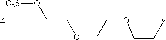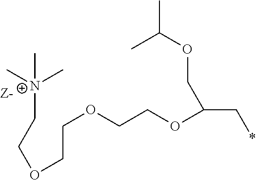 - wherein R′ is selected from the group consisting of H, CH3, CH2O(CH2CH2O)zR15, and mixtures thereof; R″ is selected from the group consisting of H, CH2O(CH2CH2O)zR15, and mixtures thereof; x+y≦20; y≧1; z=0 to 10; each R15 is independently selected from —H and —CH2CHR18N+R19R20R21 wherein R18 is selected from —H and —CH3; each R19 and R20 is independently selected from C1-C4 alkyl optionally substituted with —OH; R21 is independently selected from C1-C12 optionally —OH substituted alkyl or (CH2)rOpQ; the index r is an integer from 1 to 8; the index p is 0 or 1; and wherein Q is an anionic group selected from —CO2 −, and —SO3 −; R16 is selected from the group consisting of H, (CH2CH2O)zR15 wherein z=0 to 10, and mixtures thereof; R17 is selected from the group consisting of C1-C16 alkyl, C6-C10 aryl groups, and mixtures thereof; the index m is an integer from 0 to 4 and each R6 is as defined above; Z is a charge balancing counterion of unit charge c; the index b is equal to the number of non-H R15 groups that do not comprise a covalently bound charge balancing counterion; further provided the molecule contains at least one non-H R15 group.