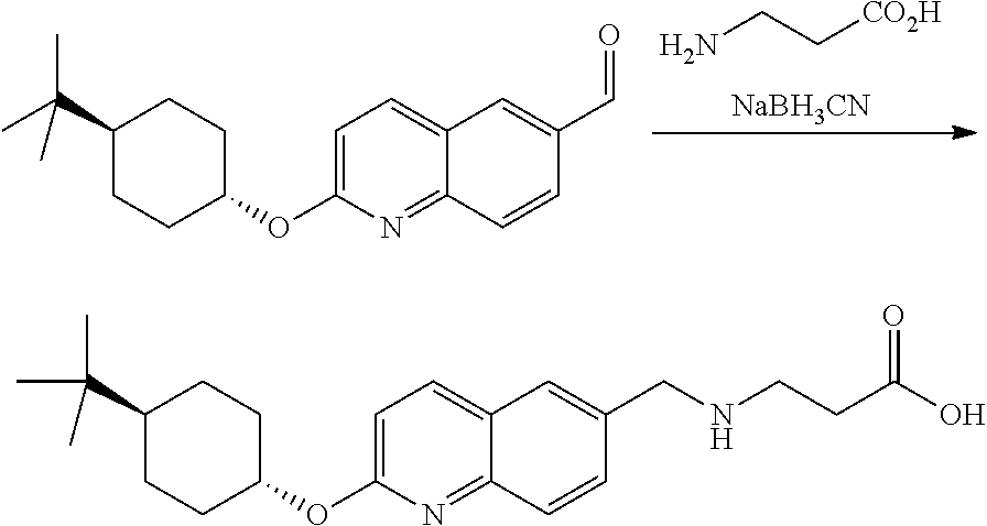 A solution of 2-(4-tert-butyl-cyclohexyloxy)-quinoline-6-carbaldehyde (30.6 mg, 0.0983 mmol) and Beta-alanine (8.75 mg, 0.0983 mmol) in ethanol (0.7 mL, 10 mmol) was heated to reflux for 2 h. The yellow solution was cooled to rt and sodium cyanoborohydride (7.41 mg, 0.118 mmol) was added and was heated to reflux for 1 h. After cooled down to rt, citric acid was added and concentrated down. The solid was suspended in water and filtrate, and the collected solid was washed thoroughly with water. HPLC purification of the solid give the product (7.5 mg, 15%). LCMS Rt=1.60 min m/z=385.49 [M+1]. 1H NMR (400 MHz, MeOD) δ=8.14 (d, J=8.8 Hz, 1 H), 7.92 (s, 1 H), 7.88 (d, J=8.7 Hz, 1 H), 7.72 (d, J=10.7 Hz, 1 H), 6.96 (d, J=8.8 Hz, 1 H), 5.29-5.09 (m, 1 H), 4.40 (s, 2 H), 3.36 (t, J=5.8 Hz, 2 H), 2.79 (t, J=6.7 Hz, 2 H), 2.30 (d, J=10.9 Hz, 2 H), 1.94 (d, J=12.9 Hz, 2 H), 1.55-1.06 (m, 5 H), 0.94 (s, 9 H).
