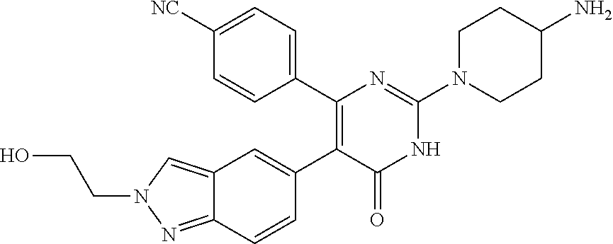 The established cancer cell line Kasumi-1 with a verified p53 mutation were purchased from American Type Culture Collection (ATCC) and routinely passaged according to ATCC published protocols. For routine assay these cells were seeded at a density of 20,000 cells per 96-well. 24 hours after plating, cells received an 11 point dilution of test compound with final concentration ranges from 100 μM to 2.0 nM. Cells are incubated in the presence of compound for 168 hours at 37° C., 5% CO2. At the end of this compound incubation period, 80 μl of media is removed and 20 μL of CellTiter 96® AQueous Non-Radioactive Cell Proliferation Assay solution (Promega) is added. The cells are incubated until the OD490 is >0.6. IC50 values are calculated using the IDBS XLfit software package and include background subtracted OD490 values and normalization to DMSO controls.
