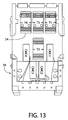 FIG. 13 is a schematic plan view of a modular jack incorporating the four channel circuit shown in FIG. 12 and illustrating the arrangement of the autotransformers and common mode chokes, according to the second embodiment of the invention;