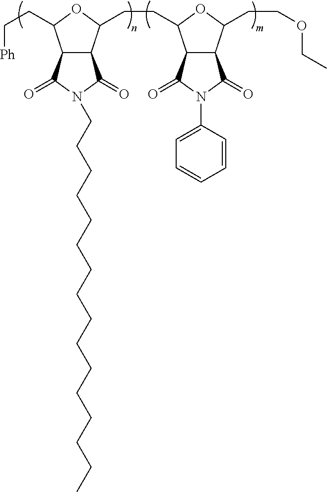 Alternatively, the first monomer can be synthesized by the reaction of exo-7-oxanorbornane-5,6-dicarboxyanhydride with hexadecylamine or N-hexadecyl-maleimide reaction with furan via a Diels-Alder reaction.