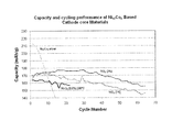 It was particularly unexpected that supplementing a high nickel content lithium storage material with a relatively low level of transition metal oxide would maintain the excellent capacity of the high nickel content lithium storage material as well as provide excellent cycle life. It was believed that at relatively low levels of transition metal oxide would provide for high capacities, but would be lacking in cycle life as the characteristics of the high nickel content materials alone would predominate. This was not the case. Indeed, even at relatively very low levels of transition metal oxide lithium storage materials (e.g. 5-20%), excellent cycle life was observed along with the very high capacities. This is particularly true when NiaCob is used as the predominant component.