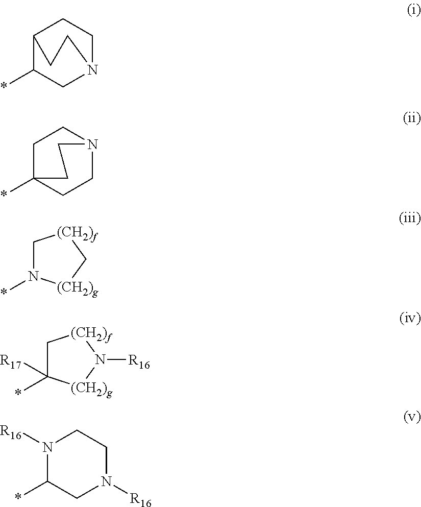 - wherein R16 is in each occurrence independently selected from (C1-C4) alkyl optionally substituted by one or more (C1-C4) alkoxy groups; R17 is hydrogen, halogen or (C1-C4) alkyl; f=0, 1, 2 or 3; g=0, 1, 2 or 3; and the asterisk (*) represents the point of attachment to the group L3 in formula (I);