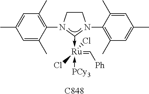 Another previously known method for controlling the rate of a catalyzed metathesis reaction is through the modification of the character of the ligands attached to the ruthenium or osmium transition metal of the carbene olefin metathesis catalyst (indigenous modification). For example, RuCl2(PPh3)2(═CHPh) reacts more slowly with cyclic olefins than RuCl2(PCy3)2(═CHPh), while RuCl2(PPh3)sIMes(=CHPh) reacts more rapidly with cyclic olefins than RuCl2(PCy3)sIMes(=CHPh), where sIMes represents 1,3-Bis(2,4,6-trimethylphenyl)-2-imidazolidinylidene and Cy represents cyclohexyl. Furthermore, ligand modification, for example, has been used to prepare latent metal carbene olefin metathesis catalysts such as C771, C835, and C871 disclosed herein. Several other latent metal carbene olefin metathesis catalysts for ROMP are known and have been disclosed in U.S. Pat. Appl. Pub. Nos. 2005/0261451 and 2012/0271019, U.S. Pat. No. RE38676, etc. Unfortunately, as is demonstrated infra, latent metal carbene olefin metathesis catalysts (e.g., latent ruthenium or osmium olefin metathesis catalysts) do not enable independent control over the time required for a prior art ROMP composition to reach a hard polymer gel relative to the exotherm time.