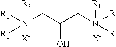 - R 3 in the di-quaternary amine alcohol described herein above is —CH 2 CH 2 OH; —CH(CH 2 OH) 2 ; or; —C(CH 2 OH) 3