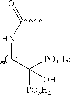 In alternative embodiments, in Formula I, R1 may be —(CR5R6)—O—C(O)—NH—(CH2)m—C(PO3H2)2OH, where R5 may be H or lower alkyl; R6 may be H or lower alkyl; m may be 1, 2, 3, 4, 5, or 6.