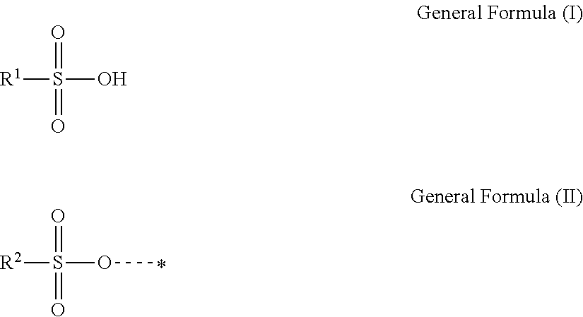 Examples of the unsubstituted alkyl sulfonic acids include the above-described sulfonic acids having an unsubstituted alkyl group as R1 in General Formula (I).