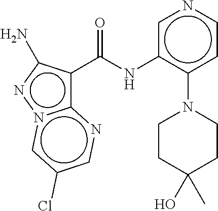 - TVUARJNKNKCNBC-UHFFFAOYSA-N CN(C)C1CCCN(c2ccncc2NC(=O)c2c(N)nn3cc(Cl)cnc23)C1 Chemical compound CN(C)C1CCCN(c2ccncc2NC(=O)c2c(N)nn3cc(Cl)cnc23)C1 TVUARJNKNKCNBC-UHFFFAOYSA-N 0.000 description 2
