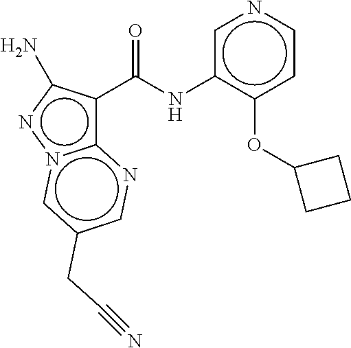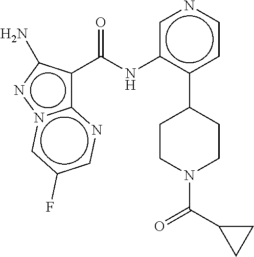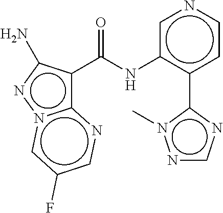 - NCCPTBXDQPTHTK-UHFFFAOYSA-N Cc1cncc(NC(=O)c2c(N)nn3cc(F)cnc23)c1-c1cncn1C Chemical compound Cc1cncc(NC(=O)c2c(N)nn3cc(F)cnc23)c1-c1cncn1C NCCPTBXDQPTHTK-UHFFFAOYSA-N 0.000 description 4