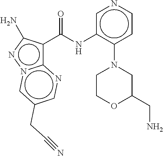 - NGBKOWAZLQQJNK-UHFFFAOYSA-N CN1CCN(c2c(C#N)cncc2NC(=O)c2c(N)nn3cc(F)cnc23)CC1 Chemical compound CN1CCN(c2c(C#N)cncc2NC(=O)c2c(N)nn3cc(F)cnc23)CC1 NGBKOWAZLQQJNK-UHFFFAOYSA-N 0.000 description 2
